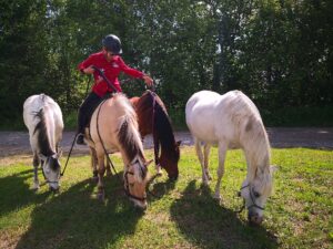 Avec les fjords nous avons utilisé des récompenses avec des friandises au début car ils étaient très sauvages et chaque gain avec eux était fort apprécié. Ils ont appris le mot ‘’bonbon’’ et savent très bien ce que ça veut dire. J’utilise peu car je ne veux pas les soudoyer mais quand c’est quelque chose de nouveau ou difficile pour eux je leur donne parfois un bonbon.