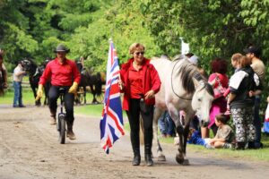 Cette excellente photo d’Indy qui se rendait au site d’une parade qu’avec une cordelette. Elle se synchronisait à mes pieds et à la position de mes bras et épaules. Quand j’ai mis mon bras plus vers la gauche ça lui donnait la permission de visiter ce qu’elle apprécie grandement car elle se sait admirée. Pour la ramener à moi, je ramenais mon bras vers la droite et je le maintenais là afin de lui rappeler que nous devions continuer notre parcours. Philippe circulait sur un unicycle autour d’elle et la calèche tirée par 6 chevaux avec clochettes bruyante était directement derrière nous. En aucun cas j’ai utilisé la voix car il y avait beaucoup de bruit dans les environs, que le langage corporel. Alors pour un cheval non entendant notre langage corporel peut être peaufiné afin de pouvoir communiquer ainsi.
