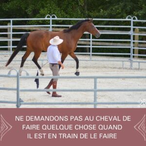 Tout comme dire ‘’non, non, non’’ ou ‘’ne fais pas ça’’. Ça ne dit pas au cheval quoi faire, tout ce qu’il comprend c’est que dans notre intonation nous ne sommes pas contents. L’article ‘’SOYONS AMBASSADEURS DU ‘’OUI’’ avec nos chevaux ‘’de la série RESPONSABILISER SON CHEVAL explique bien ce concept.