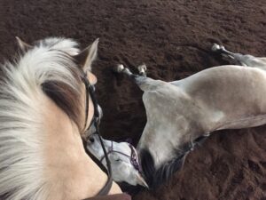 J’utilise le code ‘’ lie down’’ avec ma jument pour le coucher. Je lui ai enseignée suite au fait qu’elle se couche par mimétisme tel que démontré dans l’article précédent. Ainsi alors quand nous jouons à pied dans le manège, si je lui demande ‘’lie down’’ Indy se couche dans la mesure où elle est à l’aise avec les chevaux en liberté ou les cavalières en selle.