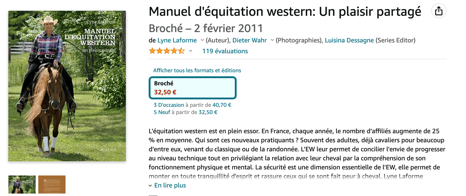 Je suis aussi l’auteure du “Manuel d’équitation Western – Un plaisir partagé” vendu à plus de 10 000 exemplaires et disponible sur Amazon.